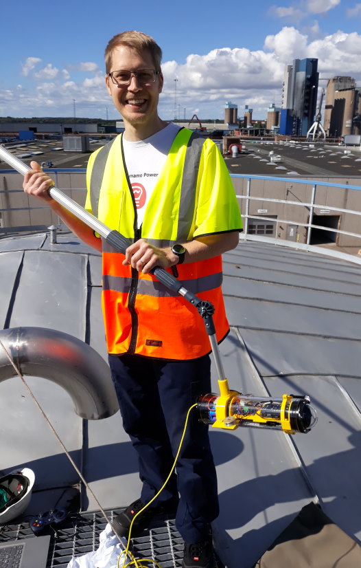 Fredrik Gustavsson holding a clean-water tank inspection camera designed and built by himself in 2020.