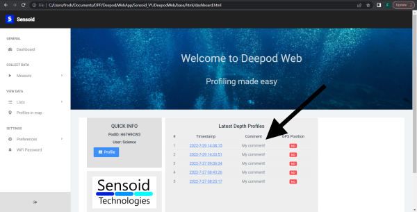 On the dash board you can see and overview of the latest data you have collected with your Deepod.
